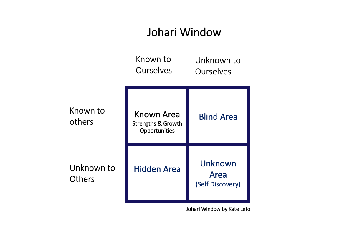 Known Area: What is known by ourselves and others. This could be about our strengths or growth opportunities. Internal and external self awareness are both present.